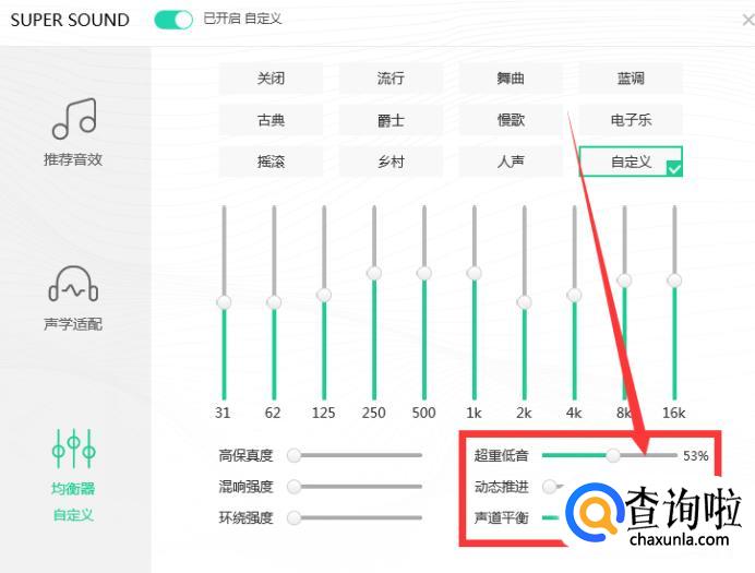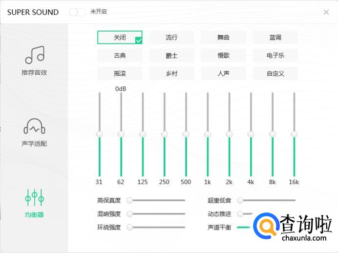 或者你需要不同的音乐设置不同的音效,那么点开下方的【均衡器】。打开均衡器后,可以调整各种不同的效果,包括有摇滚、舞曲、清新、蓝调等等。