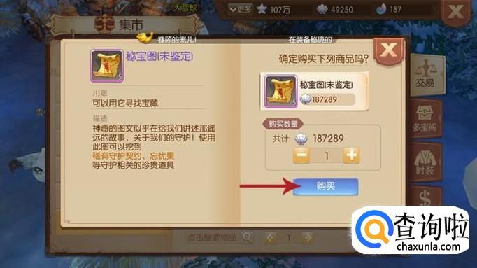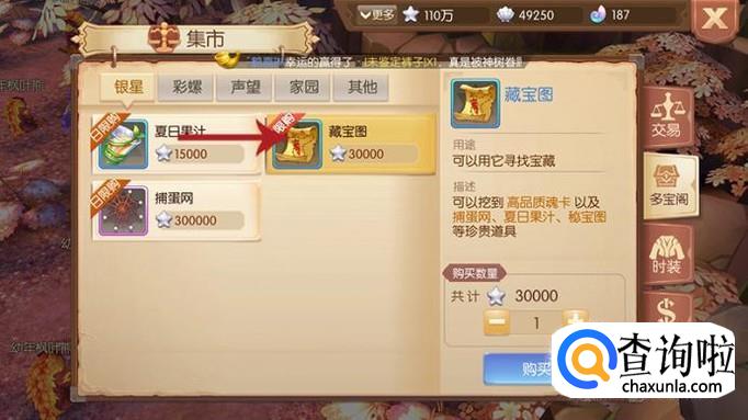 要想获得秘宝图的话,玩家可以在集市的多宝阁中直接够买藏宝图来尝试获得,每一张3W游戏币。