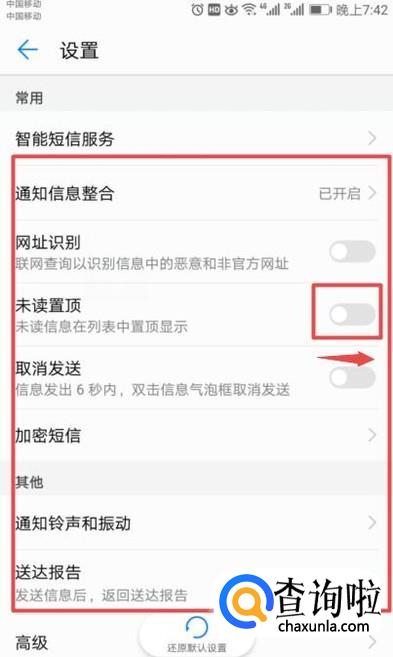 进入设置后,我们就可以看到很多可以设置的选项了,根据我们的需求可以适当的选择更改,此处我们将未读置顶的开关向右滑动打开;
