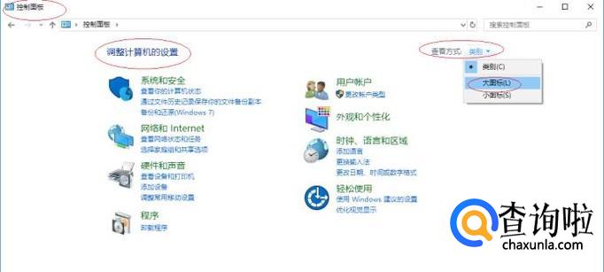 唤出"控制面板"程序窗口,如图所示。点击上侧"查看方式"文本框向下箭头,弹出下拉列表选择"大图标"项。