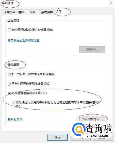 如图所示,弹出"系统属性"对话框。勾选"远程→远程桌面→允许远程连接到此计算机"单选框,点击右侧"选择用户"按钮。