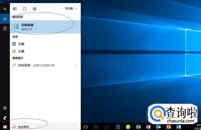 如图所示,搜索框输入"控制面板"。Cortana(小娜)显示搜索结果,点击"最佳匹配→控制面板"项。