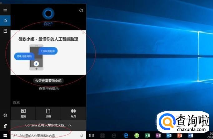 启动Windows 10操作系统,如图所示。点击任务栏搜索框,开始使用Cortana(小娜)智能语音助理。