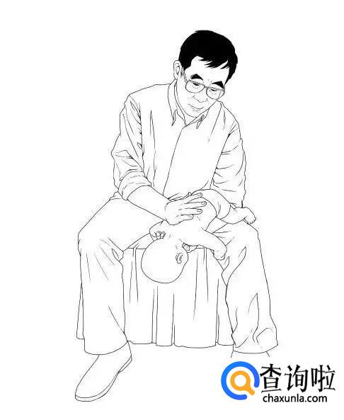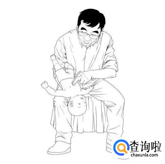 救护人应该马上把孩子抱起来,一只手捏住孩子颧骨两侧,手臂贴着孩子的前胸,另一只手托住孩子后颈部,让其脸朝下,趴在救护人膝盖上。在孩子背上拍1-5次,并观察孩子是否将异物吐出。