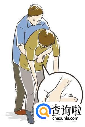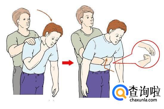 稍稍弯下腰去,靠在一固定的水平物体上,以物体边缘压迫上腹部,快速向上冲击。重复之,直到异物排出。