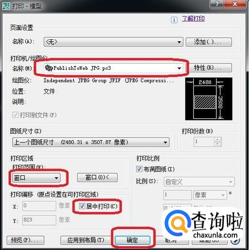 出现“打印模型”面板,如图所示,我们选择打印机名称为“PublishToWeb JPG”打印范围选择“窗口”,勾选居中打印,点击确定(也可以点击预览,看一下效果)。