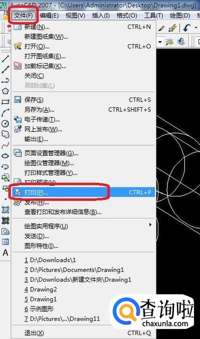 首先,我们打开CAD图形,点击“文件”,“打印”。
