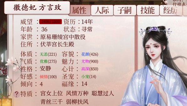 宫女作为深宫中离妃子最近的人物,是散布谣言、给他人下毒的有力助手。据需要分配,野心、地位、好感越高越有用,好感自然变长,上限为50,但不能帮助的不要顾忌好感,直接打发。
