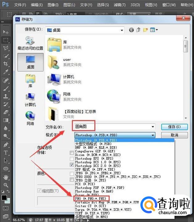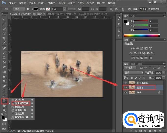 关闭图层1和背景图层,按住【ALT】键,鼠标放在【图层1副本】和【圆角矩形】之间出现箭头是鼠标左击。(接下来保存为png格式,同方法一6、7步骤)