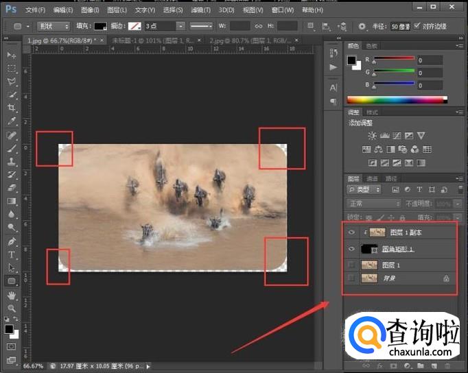 在图层1上操作,依次选择【矩形工具】-【圆角矩形工具】,右上角半径设置为:50像素
