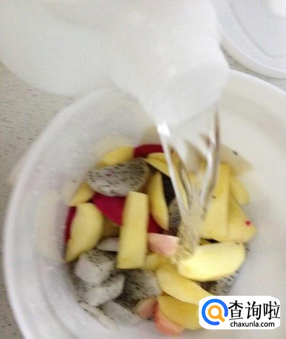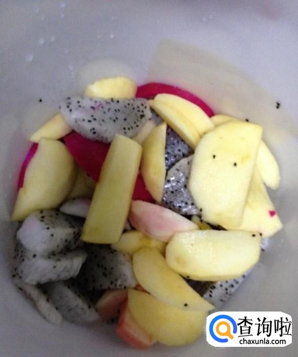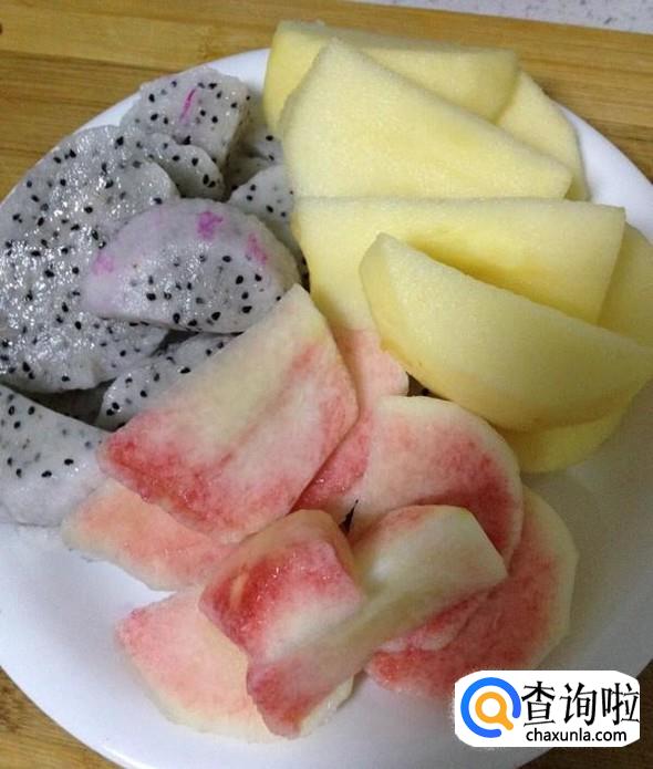 火龙果一个,苹果一个,桃两个,黑加仑一把,白糖400克,纯净水4升