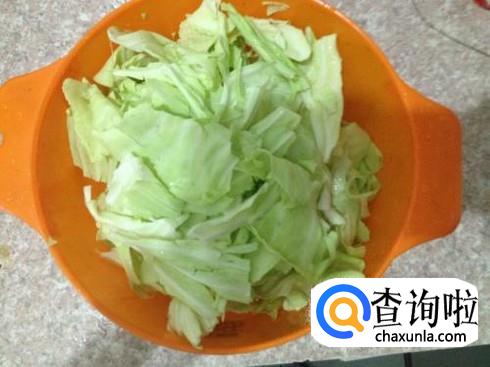 莲白洗净,用盐水浸泡。然后,捞出,洗净,切成段状,放入盆中。