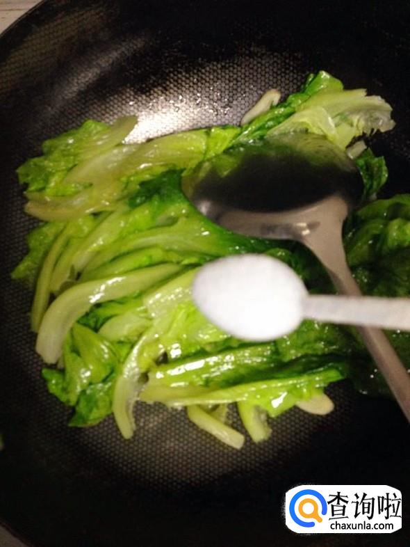 当锅盖上有很多水蒸气时,打开锅盖,把生菜轻轻地翻炒几下,并加入1小勺盐调味。