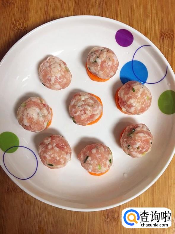 分别用勺子挖取适量肉糜,整成肉丸,放置在胡萝卜片上。
