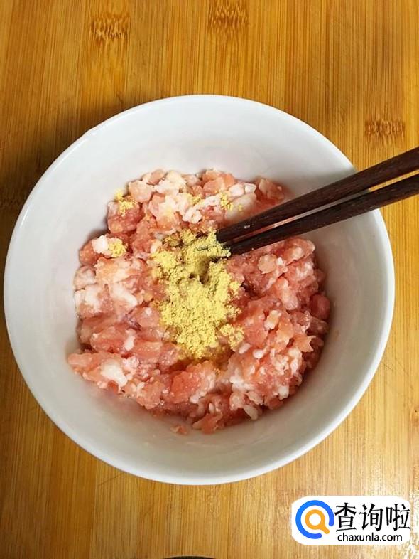 去皮五花肉用温水清洗干净,然后剁碎,放入碗中,依次加入1小勺料酒和生姜粉,拌匀。