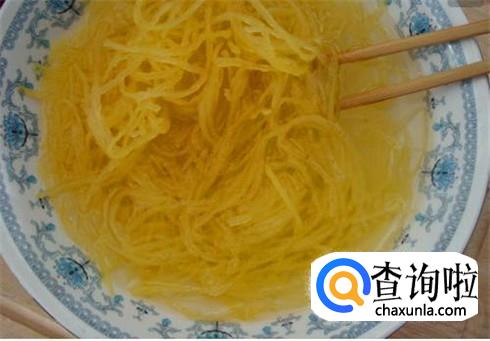蒸熟之后赶紧拿出来放进冷水中浸泡,这样搅瓜吃起来口感才好,浸泡五分钟之后捞出来,用勺子把里面的丝挖出来用清水冲一下控干水分。