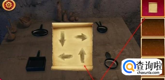 房间的右侧有一个书架,点击书架的中间部分,会出现一本书。用刚刚得到的小刀挖取书的中间部分,会得到一张带有4个剪头的纸张。书页的最下方会有一个提示。香蕉代表黄色,意思是黄色等于1