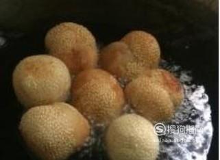 用剩下的面团揉成一个个的圆团,裹上一圈白芝麻,下油锅炸制金黄,这个是麻圆。