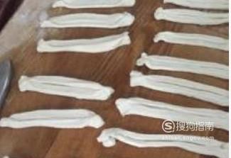 面团醒好后我们可以做各种各样的油炸面食,揪下一块面团,揉成一个长条,然后切成小段,让两根小条捏在一起。