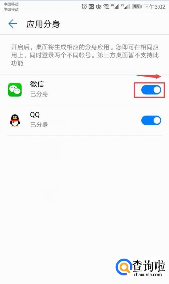 弹出的界面,我们将微信的分身开关向右滑动打开,这样我们就可以登录两个微信了。