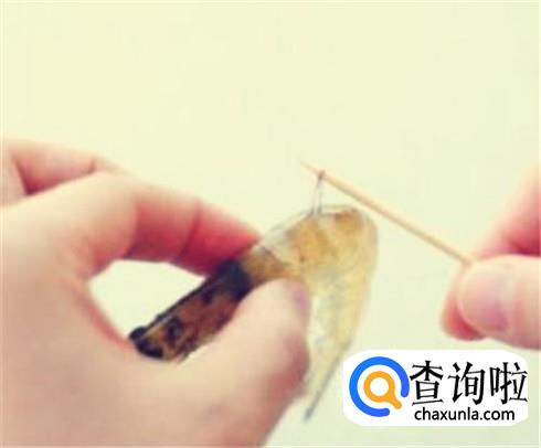 继续使用剪刀,或者使用一根牙签,虾尾从后背挑开,直接把虾线挑出来。
