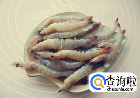 虾浸泡水里洗一下,捞出来用剪刀剪去虾须。