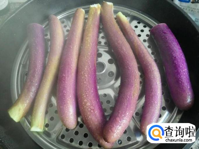 然后我们把茄子去蒂后用清水清洗干净,然后上蒸锅大火蒸15分钟左右,等茄子一戳就破就可以了。