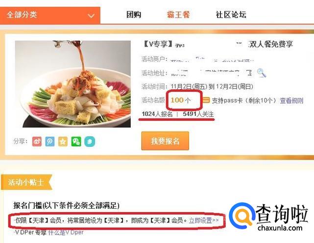 我们看到,该霸王餐的活动名额是100个,基本是十分之一的中选概率,成为VIP会员的条件很简单,经常参与活动,经常点评就可以了。我们可以多报名几家,那样吃到霸王餐的可能性就会大很多了。