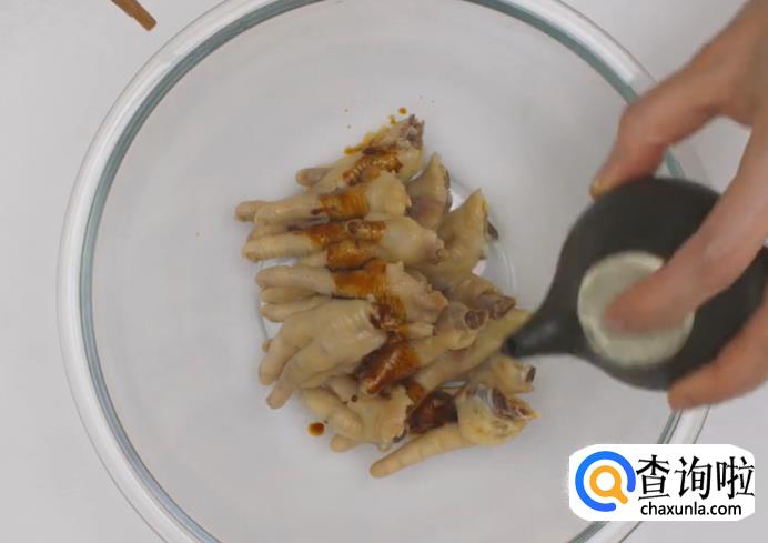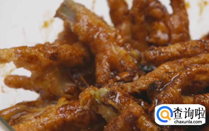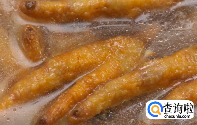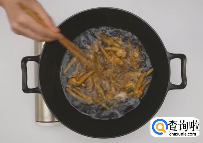 起油八成热,下入鸡爪炸3分钟。