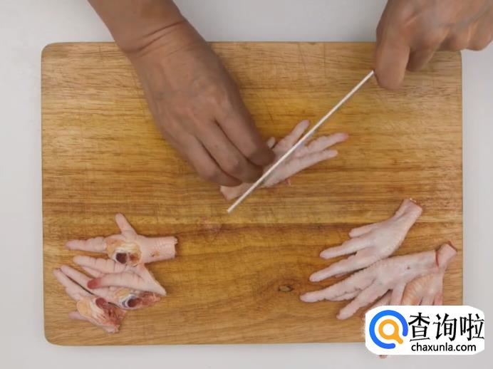 首先剪去鸡爪指尖,把鸡爪切成两半。