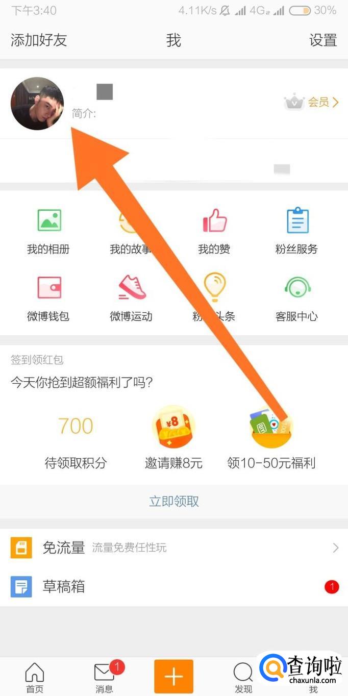 首先进入手机微博页面“我”,点击左上角的微博头像。