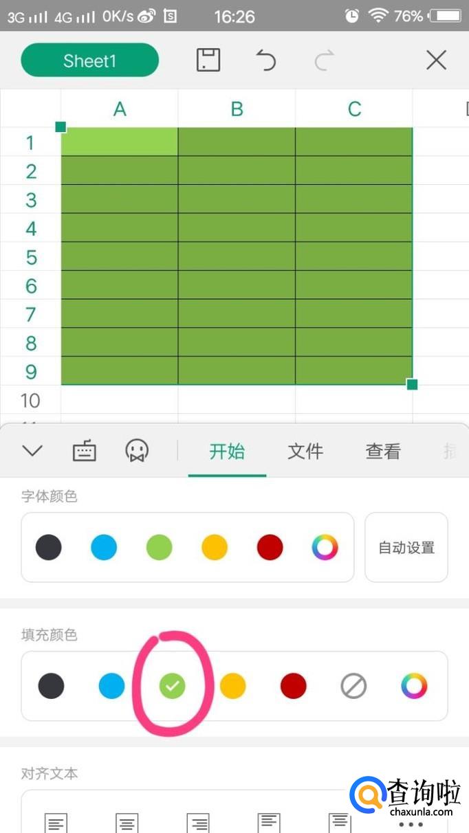 往上拖动,选择填充颜色,我们可以选择绿色,点击左上角保存按钮即可完成。