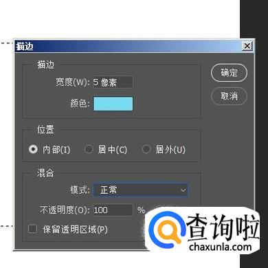 按下快捷键:ALT+E+S;调出描边对话框;设置描边宽度为5像素;混合模式为正常。再点确定。