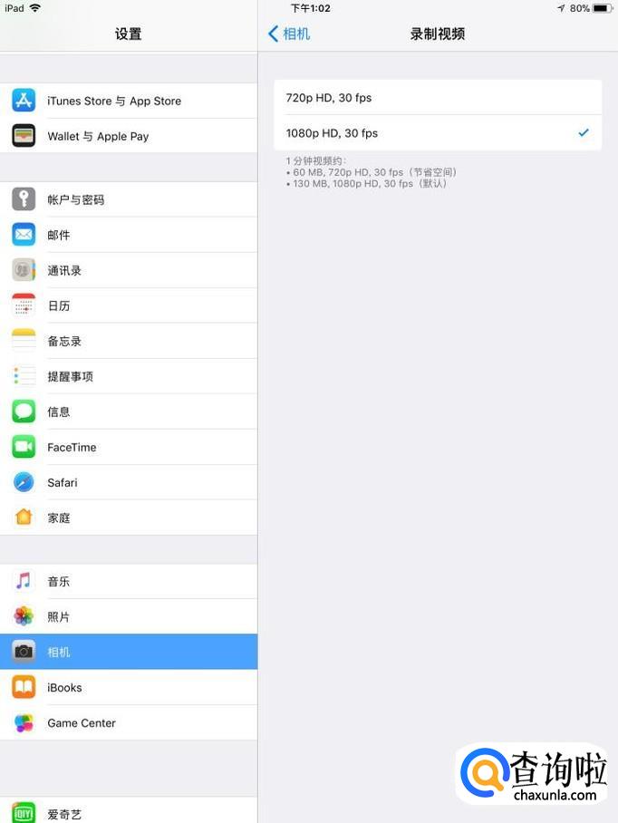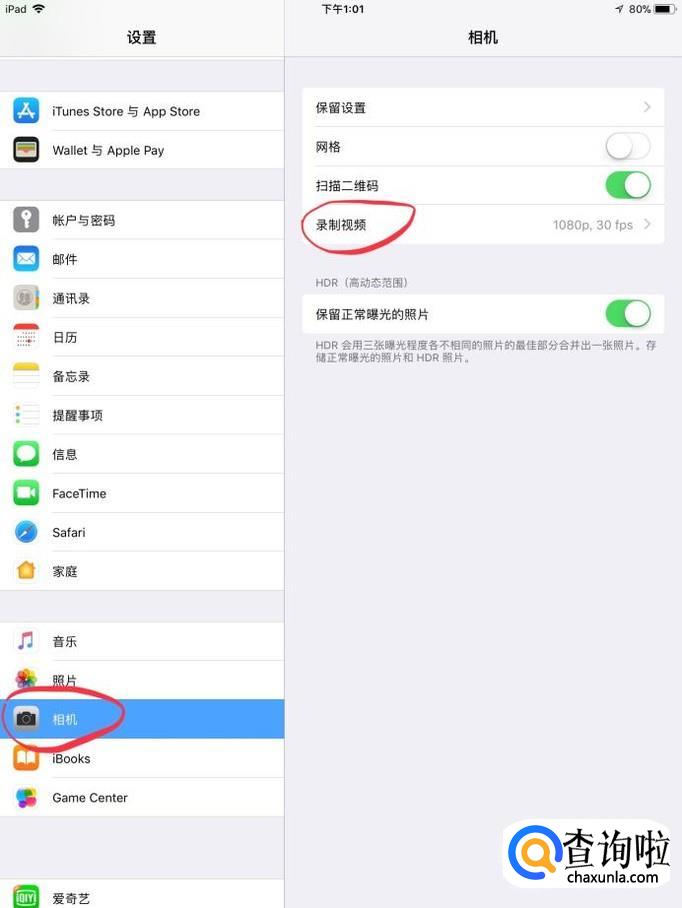 在ipad的设置功能内,找到“相机”中的录制视频选项,进行操作。