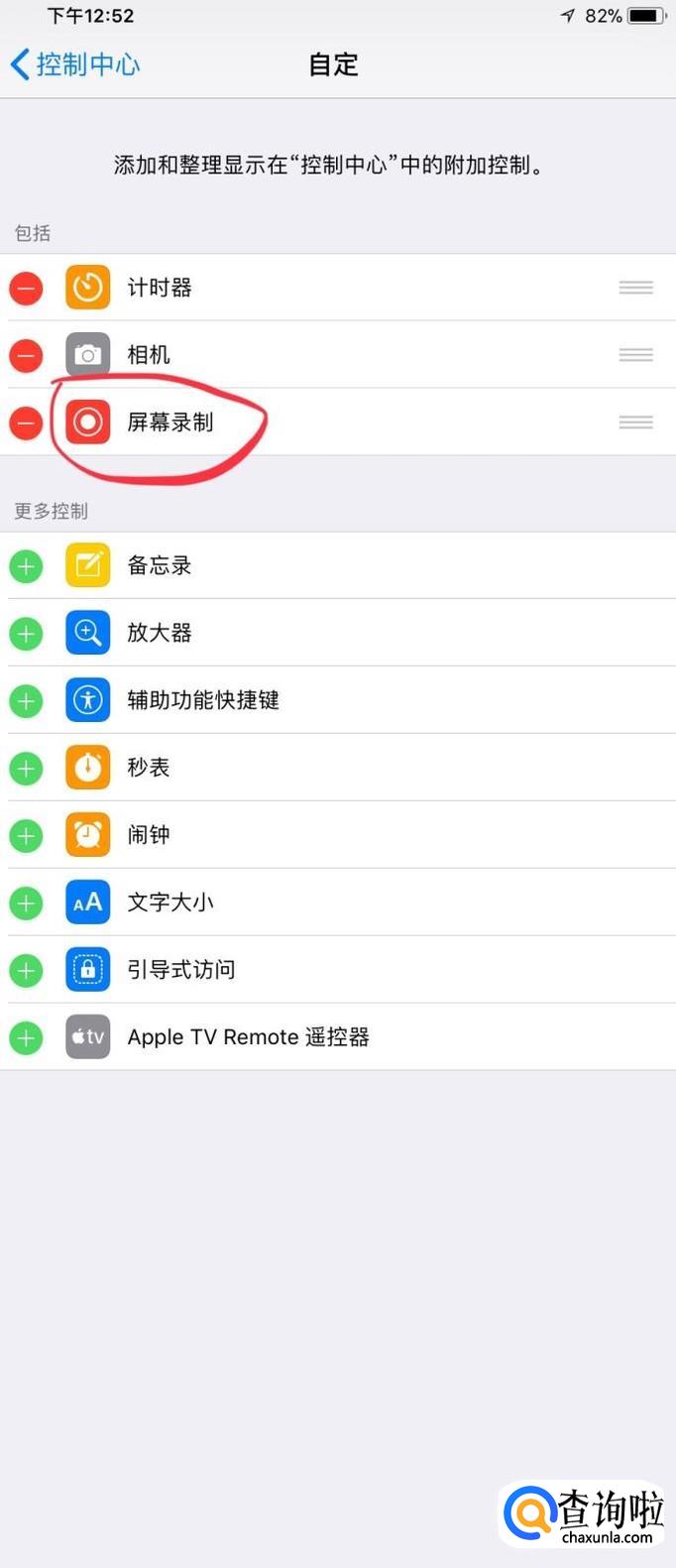 在自定控制内,在下方找到“屏幕录制”点击绿色的加号,开始添加到控制中心。。