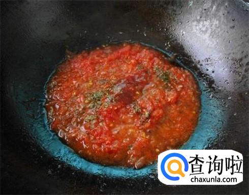 热锅下油,放入姜蒜葱煸香,然后倒入番茄丁,把番茄丁炒成番茄汁。