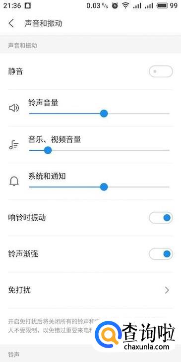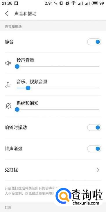 进入声音和振动设置界面,查看一下有没有开启“静音”,开启了的话就要将右侧滑块关闭。