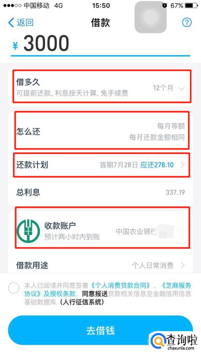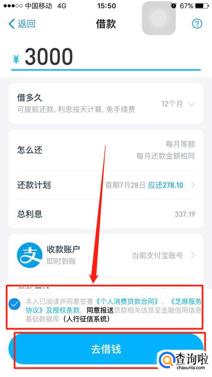 最后同意下方的协议,点击“去借钱”就完成了。