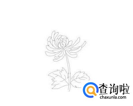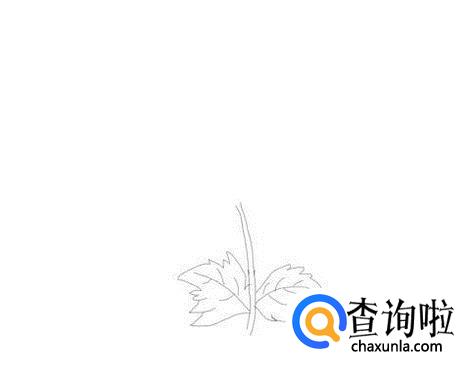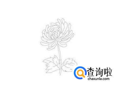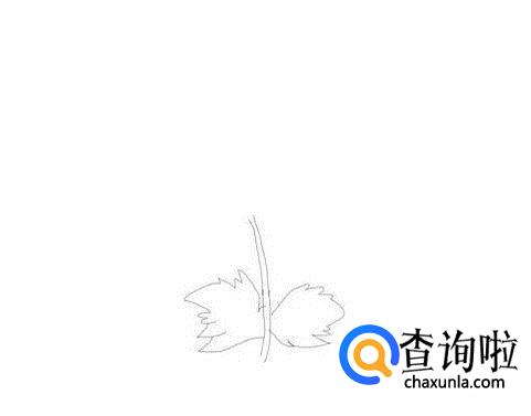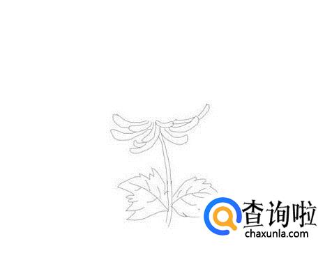 先画出菊花的花茎,然后在花茎的两侧再画出两片叶子的轮廓,如图所示: