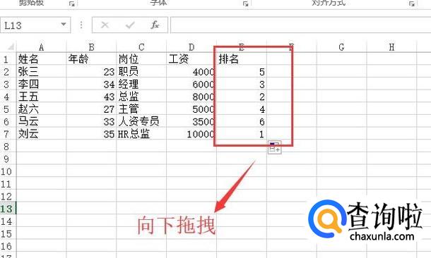 接下来拖住第二个单元格的右下角往下拉就会得到所有的排序结果,如下图所示