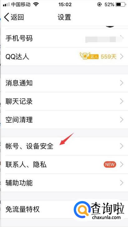 在设置功能里面往下拉,直到看到账号、设备安全就点击进入。