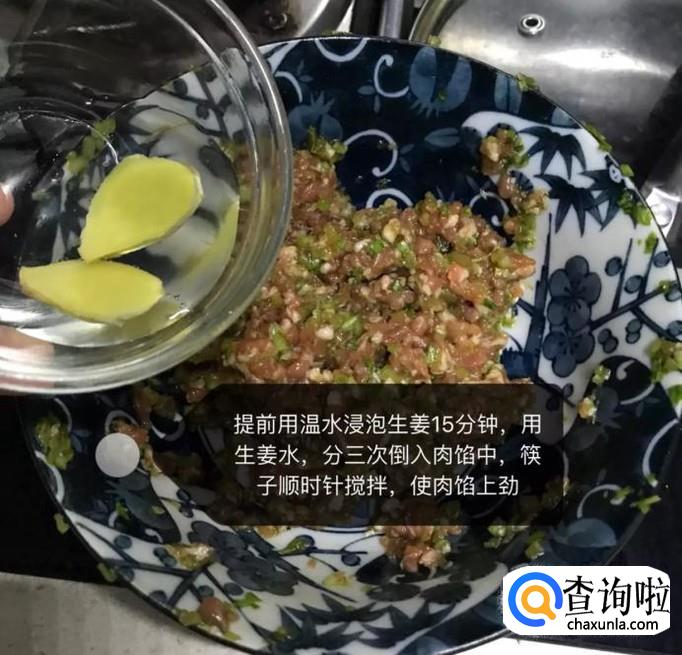 然后往肉馅中,分三次加入提前浸泡好的生姜水,搅拌上劲,如下图所示。