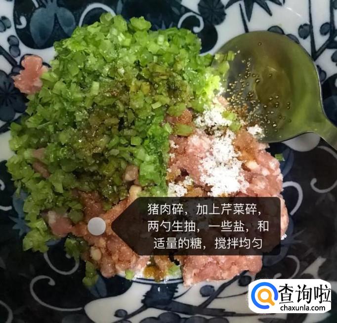 接着在一个碗内加入猪肉碎,芹菜碎,两勺的生抽,适量的盐和适量的谈搅拌均匀,如下图所示。