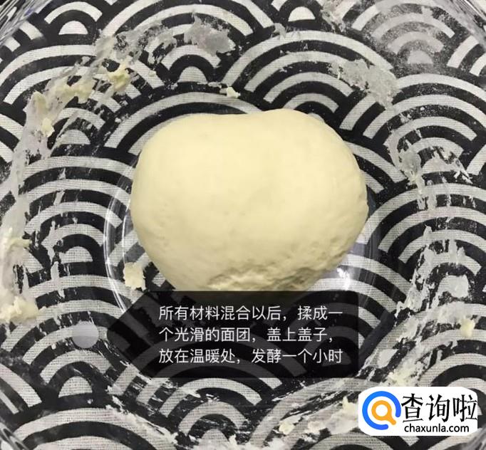 然后把所有的材料混合搅拌均匀,揉成一个光滑的面团,放到温暖的地方醒发一个小时,如下图所示。