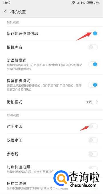 打开后会看到有很多设置,我们只需要把地理位置信息和时间水印打开即可,那么以后拍照就会自动显示地点和时间了。