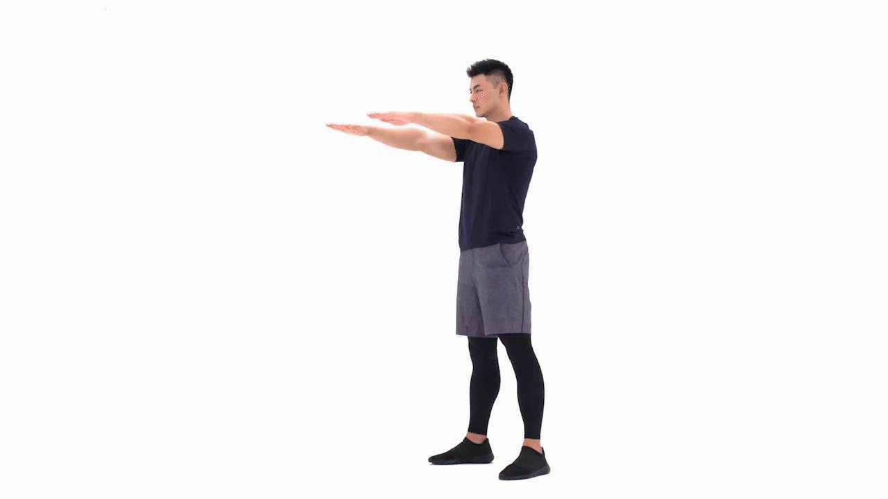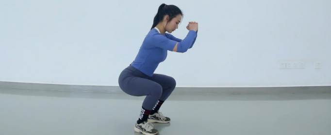 4、下蹲时候,双手向前伸直,肩膀与脚是同一直线上的,蹲至与大腿成直线时再站立。