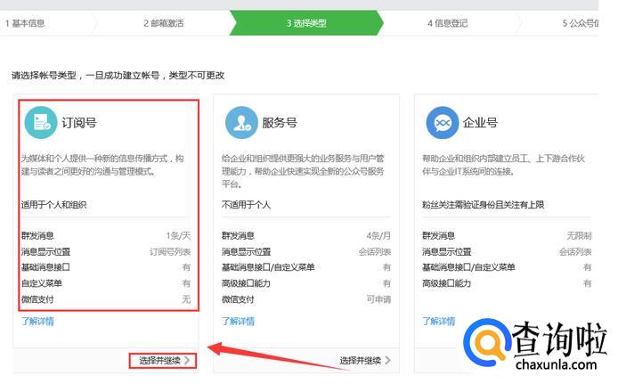 进入后选择你想要申请微信公众号的类型点击进行并继续(如选择订阅号)。