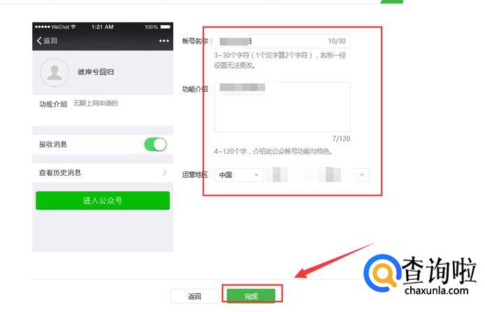 进入后填写好账号名称和功能介绍,选择好国家点击完成就成功的申请到微信公众号了。