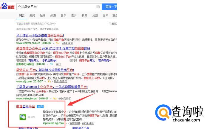 在搜索引擎内输入公共微信平台,找到公共微信平台官网进入。