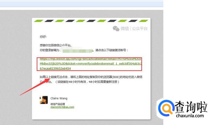 之后你的邮箱会收到微信公众平台发来的注册信息,打开邮箱,点击链接进入激活账户。